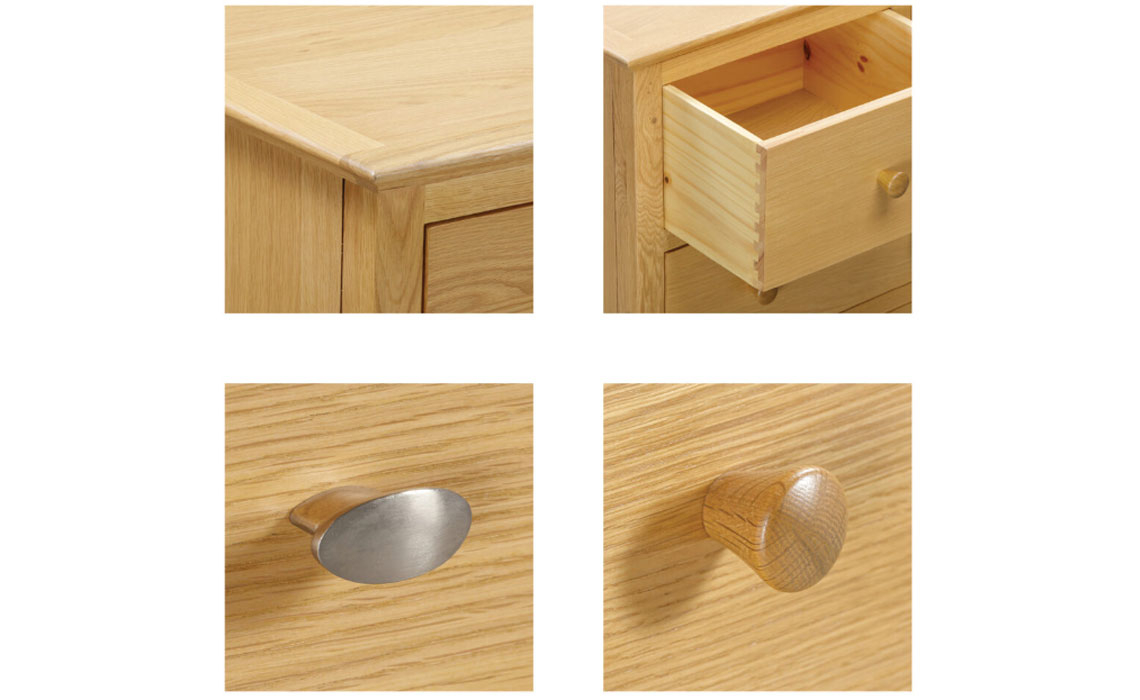 Beautifully crafted using oak and oak veneers, pine and rubber wood. Supplied with an oval metal handle and a round wooden knob for choice. Beautiful dovetail drawers, moulded tops for a sleek design and petite in size, perfect for modern living. Finished in a soft protective light lacquer allowing for the natural hue of the timber grain to shine through. A stunning contemporary collection.