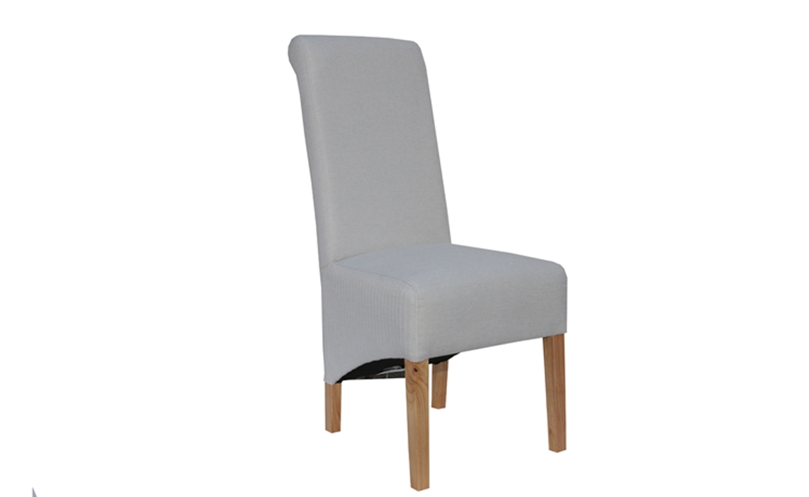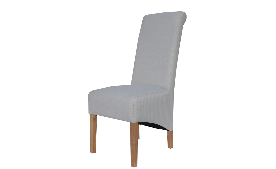 A stylish scroll back dining chair finish in a choice of three upholstery fabrics . This roll back dining chair combines style with comfort, making an elegant addition to any room. Each chair has a sprung and belted seat area for additional comfort and to retain bounce and shape, Solid Hardwood legs, Supplied fully assembled. (Please note: price shown is per chair and only available in boxes of two)
